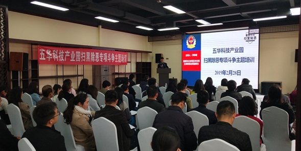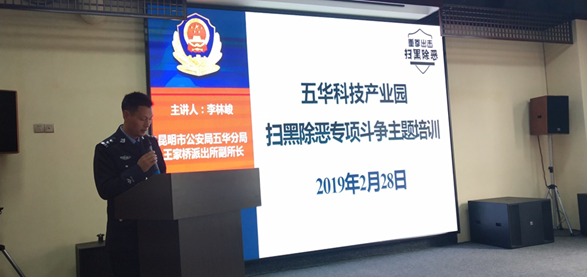 为扎实开展园区扫黑除恶专项斗争工作,统一思想,加强宣传,2019年2月28日五华科技产业园邀请了王家桥派出所李副所长为园区党员及部分企业代表开展扫黑除恶专项斗争主题培训。培训会上通过传达上级有关扫黑除恶重要会议精神,让广大党员群众知晓、明白扫黑除恶的重要意义;同时,又为大家讲解了扫黑除恶专项斗争基础知识,了解严厉打击的10类黑恶势力违法犯罪对象及举报方式,为维护园区治安秩序和谐稳定,做好防范工作。