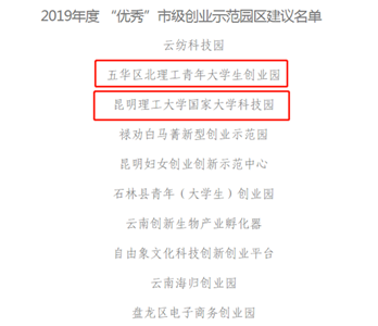 园区北理工青年大学生创业园和昆明理工大学国家大学科技园被认定为2019年度 “优秀”市级创业示范园区