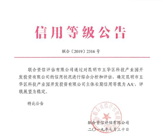 2019年7月30日,昆明市五华区科技产业园开发投资有限公司(以下简称“园投公司”)获得联合资信评估公司给予的AA-主体长期信用评级,评级展望为稳定。此次AA-评级是园投公司首次取得公开市场外部评级,是公司拓宽投融资渠道,完善公司信用体系建设,做实公司实体经济,促进市场化转型迈进的新的一步。