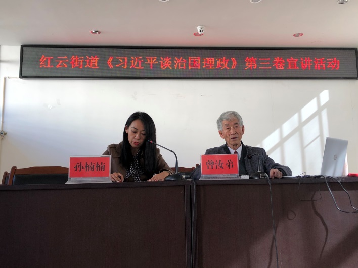 根据五华区委宣传部的统一部署,11月18日下午,红云街道组织开展《习近平谈治国理政》第三卷宣讲活动,邀请昆明学院教授曾汝弟为大家授课,曾教授是云南省“五老”宣讲团成员、昆明市“五老”宣讲团副团长、昆明市心理学会终身荣誉会长。在学术研究、授课讲学方面有着较高的造诣。此次宣讲内容为《习近平谈治国理政》第三卷。会议由红云街道宣传委员主持,街道各办、社区共计60余名党员参加。