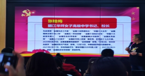 嘉宾老师向参会教师们详细介绍了平凡而伟大的张桂梅老师。带领大家分享了阅读《我有一个梦想——全国优秀共产党员张桂梅的故事》的感悟。