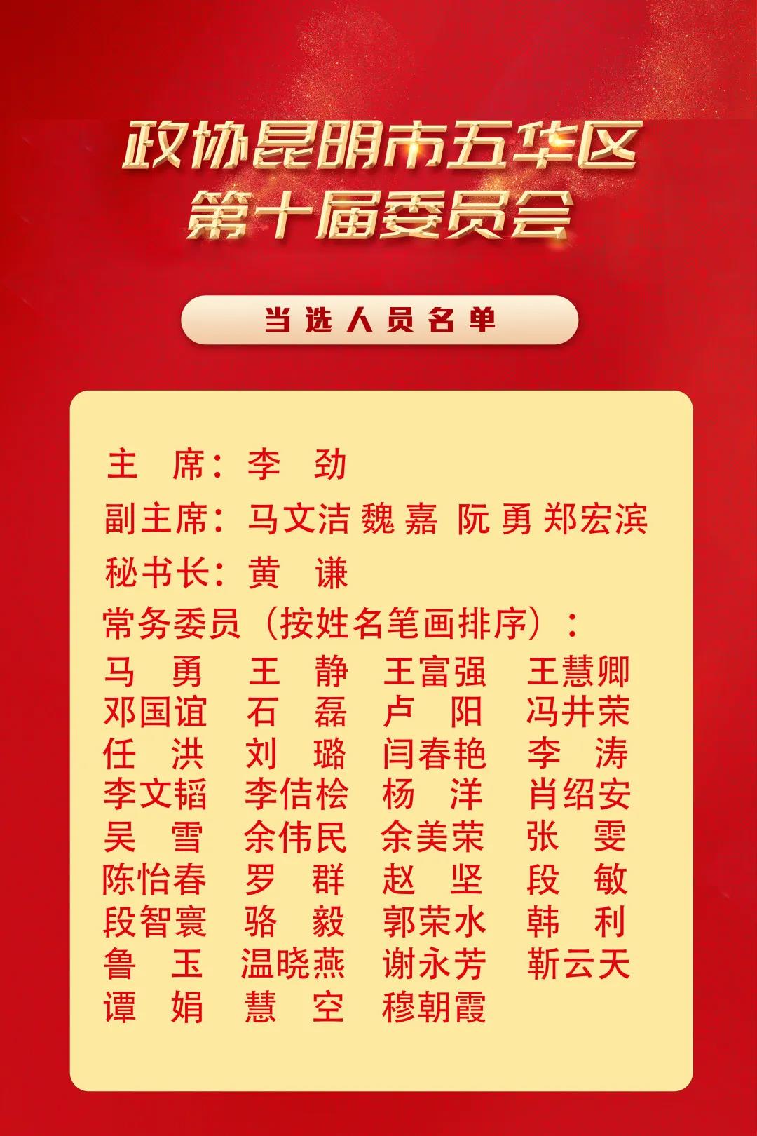 1月14日下午,政协昆明市五华区第十届委员会第一次会议圆满完成各项议程后,在连云宾馆大礼堂胜利闭幕。大会选举产生了政协昆明市五华区第十届委员会主席、副主席、秘书长、常务委员。