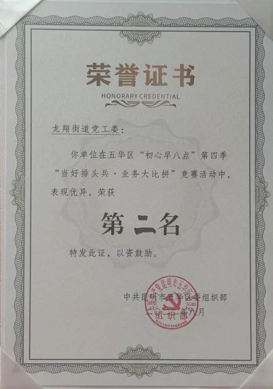 在8月17日下午进行的五华区“初心早八点”第四季“当好排头兵·业务大比拼”竞赛决赛中,龙翔街道代表队努力拼搏、奋勇争先,荣获了全区第二名。