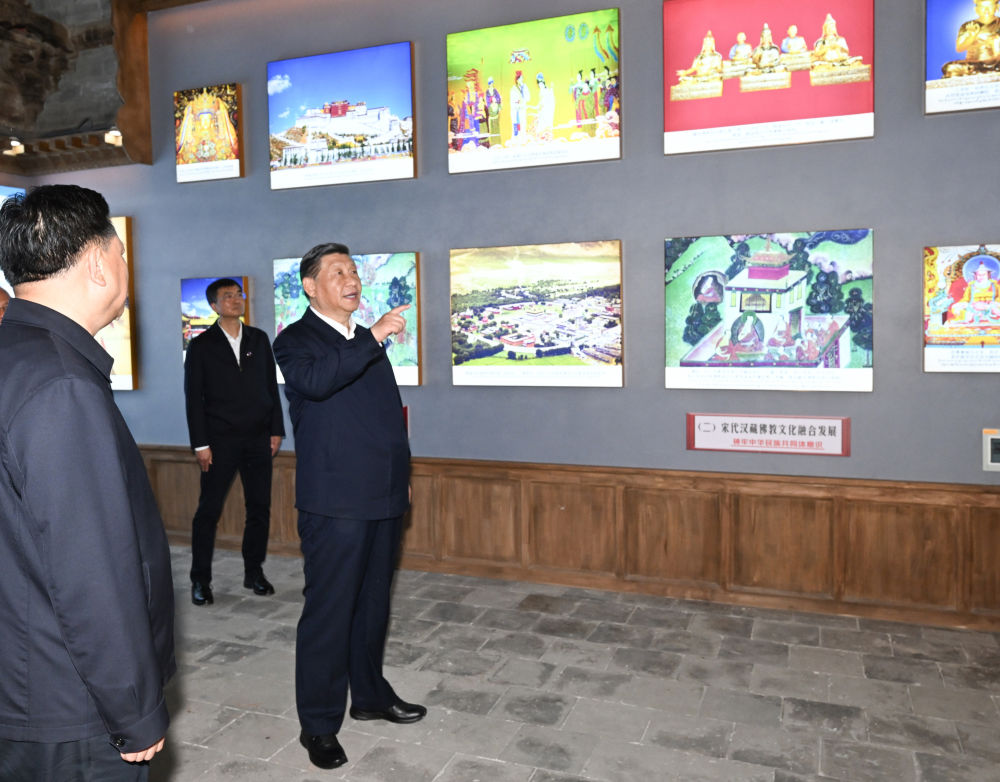 随后,习近平来到位于西宁市城中区的宏觉寺。在寺前院落,宏觉寺民主管理委员会负责人向总书记敬献哈达,僧人提香炉、持宝伞迎接总书记。习近平参观青海省民族团结进步教育基地展陈等,了解寺庙历史沿革、老一辈革命家关心推动民族工作和宗教工作的情况。他走进大殿,听取寺庙加强日常管理、促进民族团结进步等情况介绍。习近平指出,宏觉寺这座千年古刹,在增进历代中央政府与藏传佛教联系方面发挥了重要的桥梁纽带作用。要保护好这份珍贵的历史文化遗产,为铸牢中华民族共同体意识、促进民族团结进步作出新贡献。要向老一辈革命家学习,把新时代党的统战工作、民族工作、宗教工作做得更好。习近平强调,以中国式现代化全面推进强国建设、民族复兴伟业,需要全国各族人民包括广大信教群众团结奋斗。希望青海藏传佛教界弘扬爱国爱教优良传统,促进宗教和顺、社会和谐、民族和睦,在中国式现代化进程中发挥积极作用。