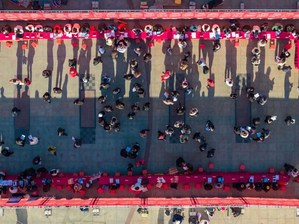 2025年1月15日,求职者在招聘会现场了解招聘信息(无人机照片)。新华社发(阮雪枫摄)