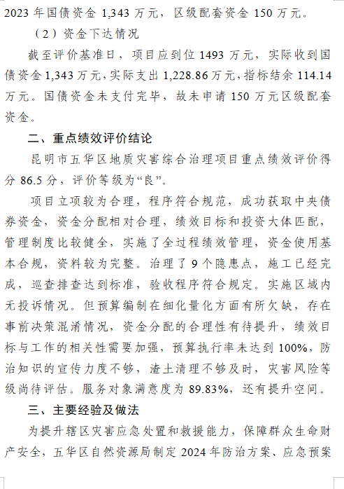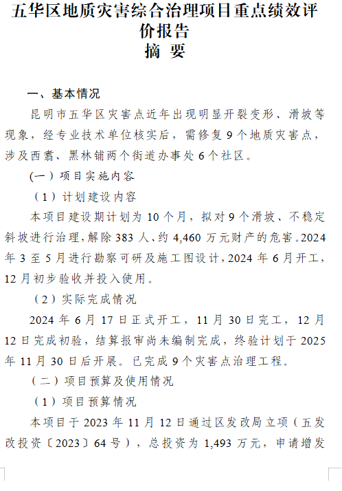 五华区地质灾害综合治理项目重点绩效评价报告摘要