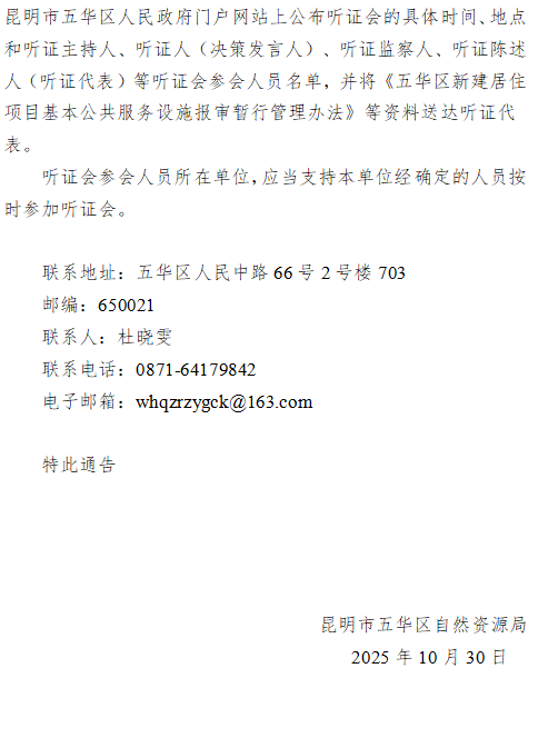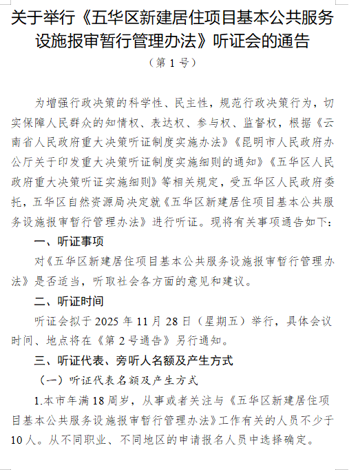 关于举行《五华区新建居住项目基本公共服务设施报审暂行管理办法》听证会的通告