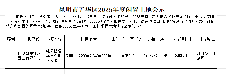 昆明蕻龙银河置业有限公司闲置土地公示