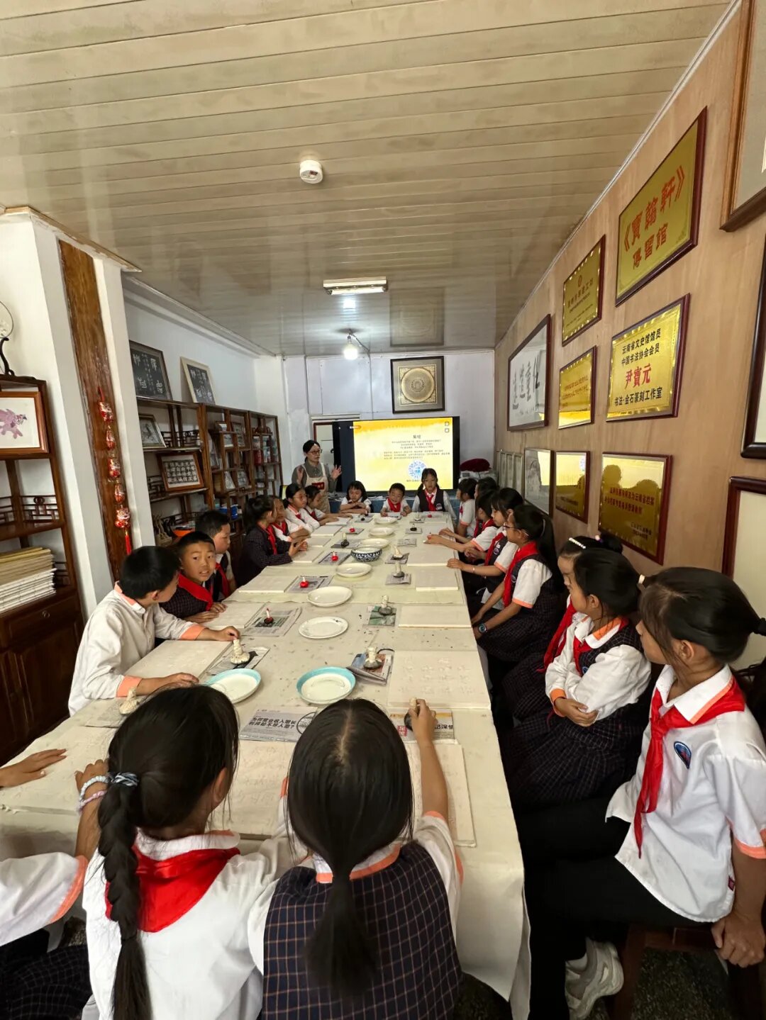 为了增强非物质文化遗产保护传承意识,加大非遗传承发展力度,特邀请了云南省滇派书画装裱代表性传承人张惠玲、昆明市滇派书画装裱代表性传承人孙源和五华区滇派书画装裱代表性传承人张琳娜为孩子们授课。