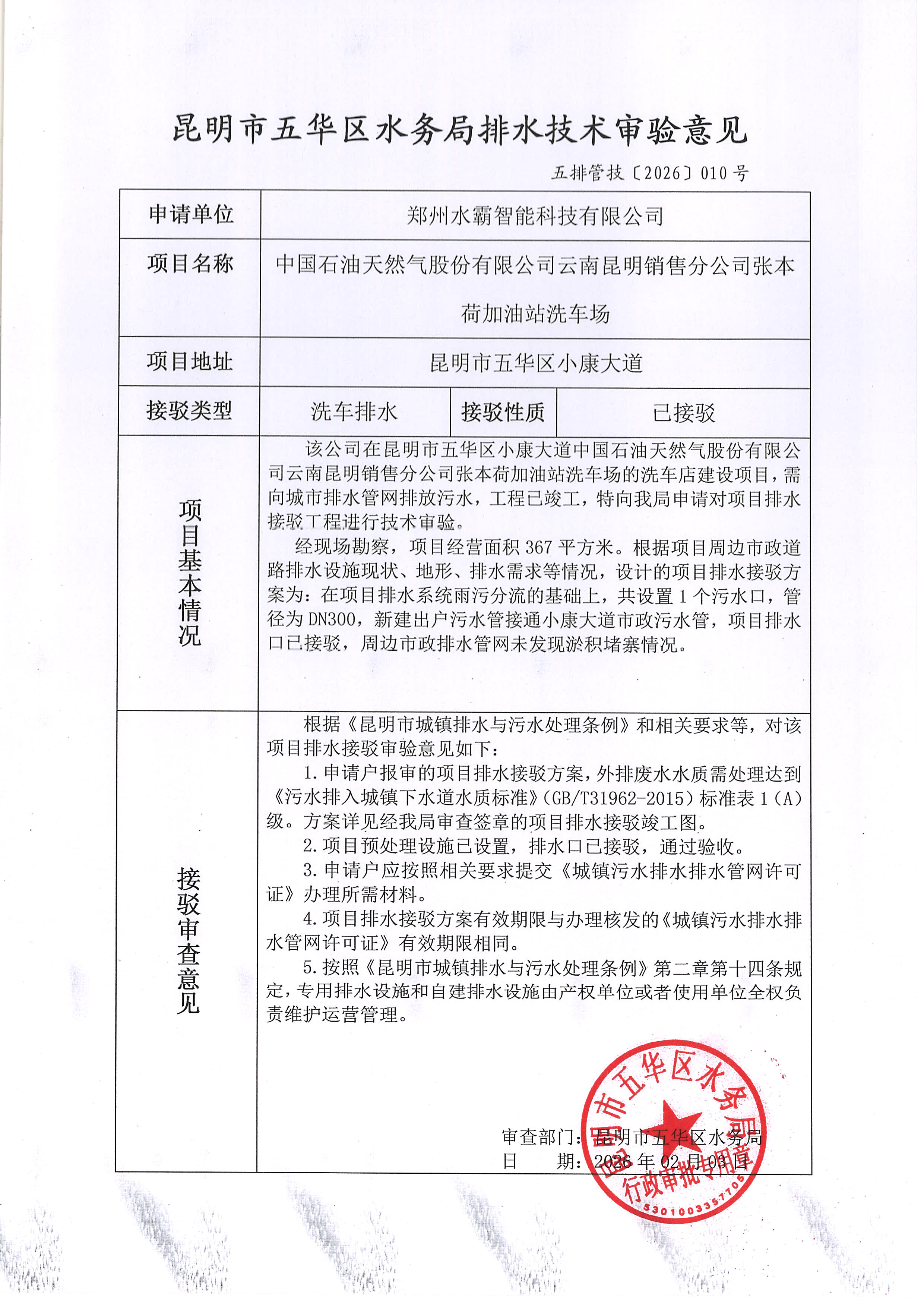 昆明市五华区水务局排水技术审验意见 五排管技[2026]010号