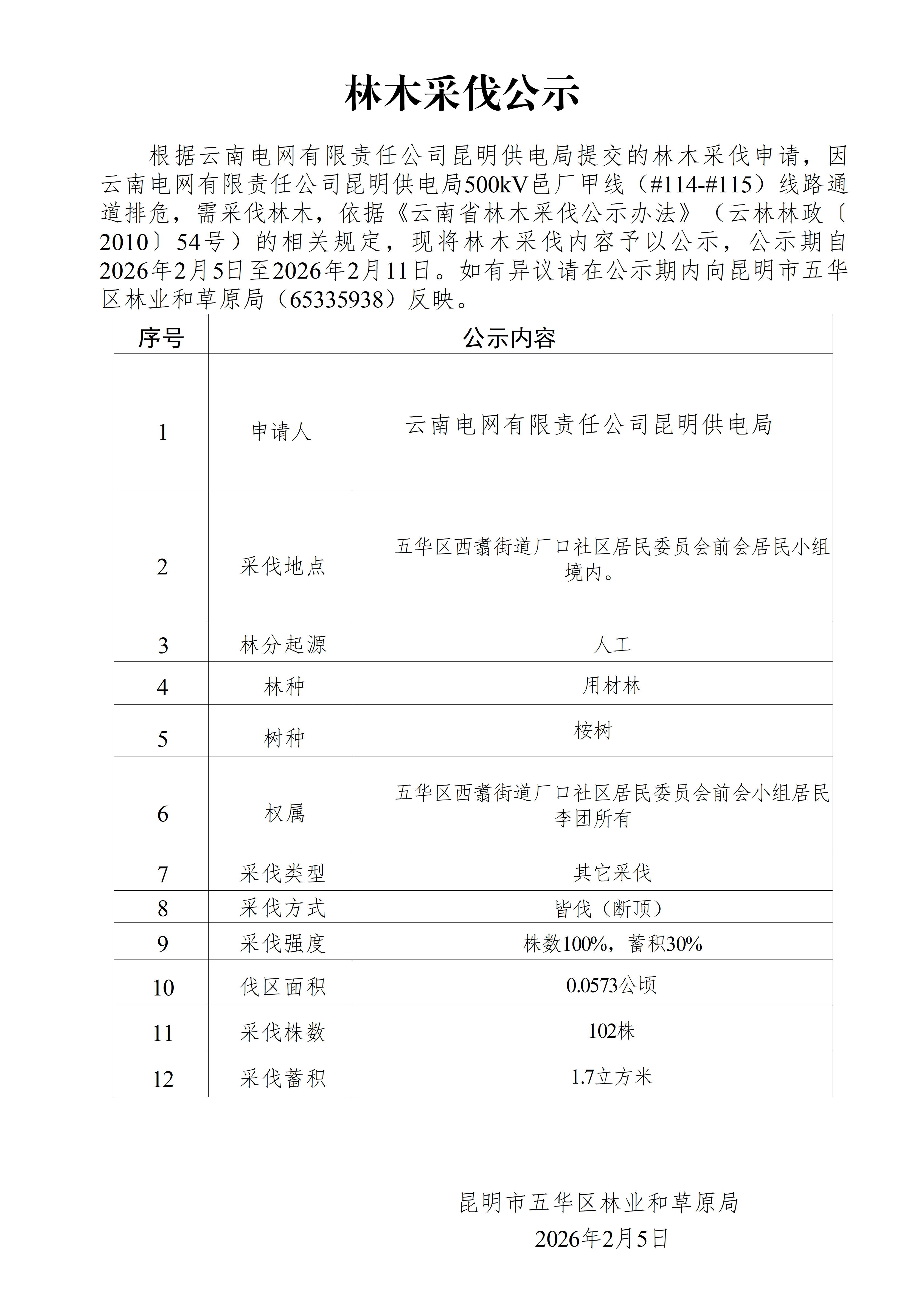 林木采伐公示(云南电网有限责任公司昆明供电局500kV邑厂甲线(#114-#115)线路通道排危)