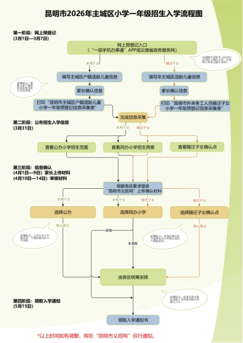 昆明市2026年主城区小学一年级招生入学流程图