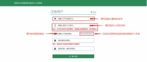 进入注册页面后,首先,根据系统要求填写适龄儿童的有效身份证号码(适龄儿童:2020年8月31日前出生,含8月31日)、监护人手机号码;其次,点击“获取校验码”,系统自动发送校验码至手机;再次,填写校验码,并设置登录密码(密码必须为6-20位的字母+数字的组合,如:123abc);最后,点击“确认注册”完成注册,系统将提示注册成功并返回登录页面。如下图: