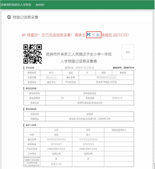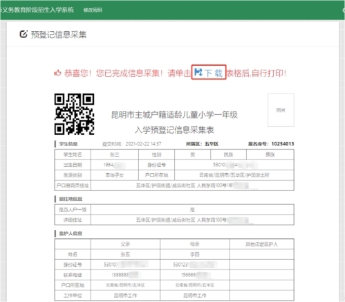 确认提交后,系统将进入信息确认表打印页面并提示您已完成信息采集。点击“下载”按钮,系统会将信息采集表以图片形式保存在电脑中,家长只需要将图片用A4纸打印并粘贴学生照片即可。如下图: