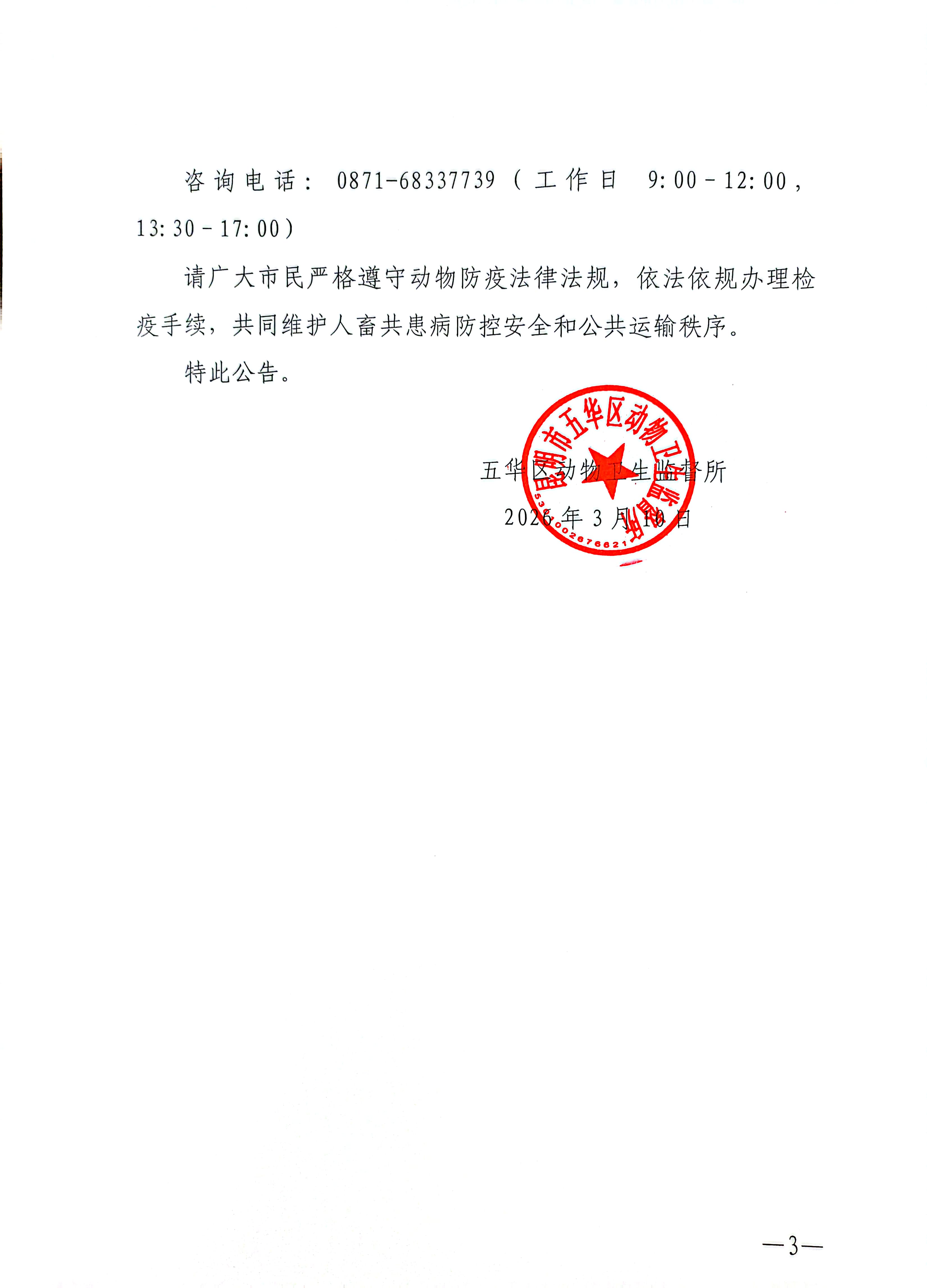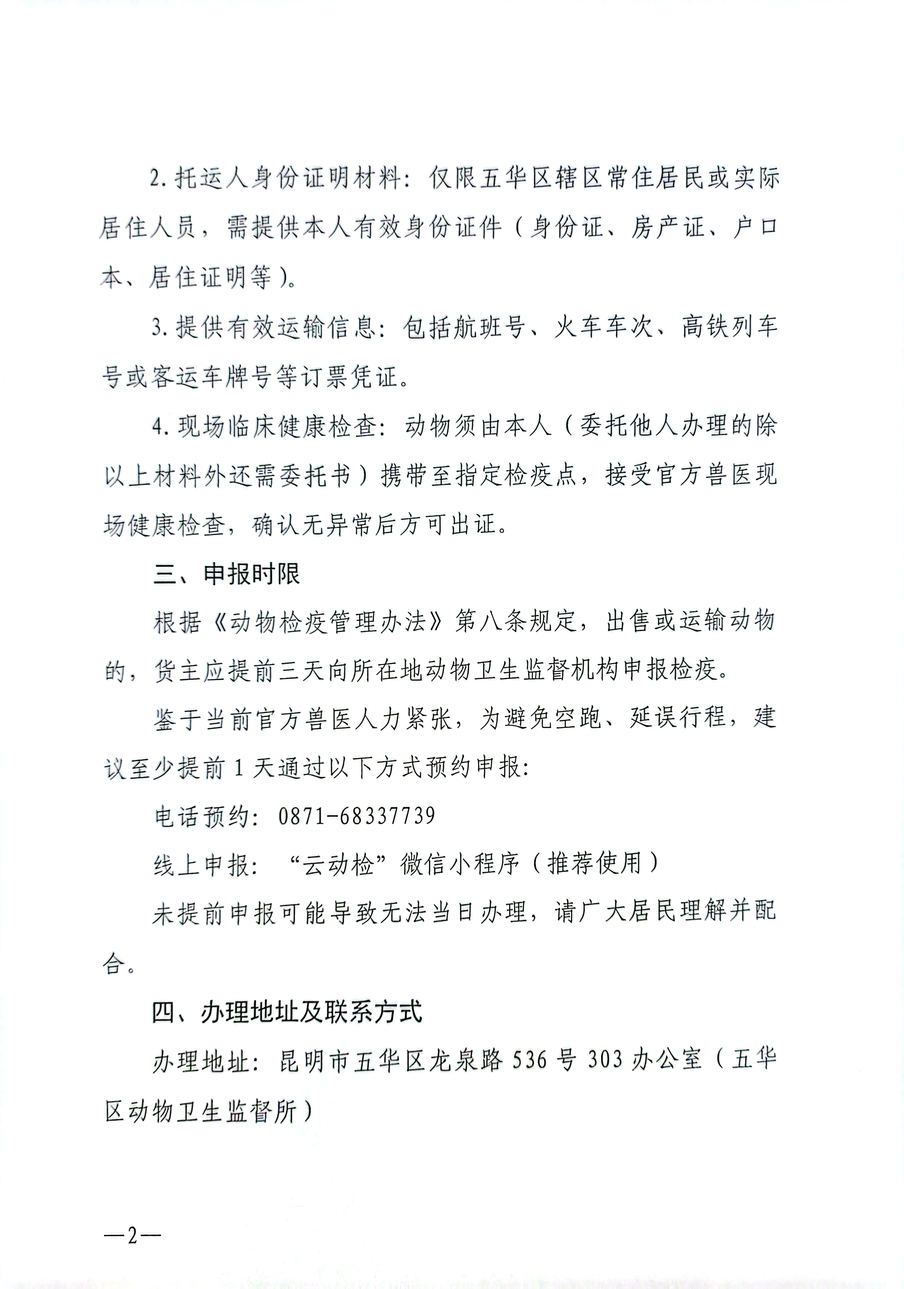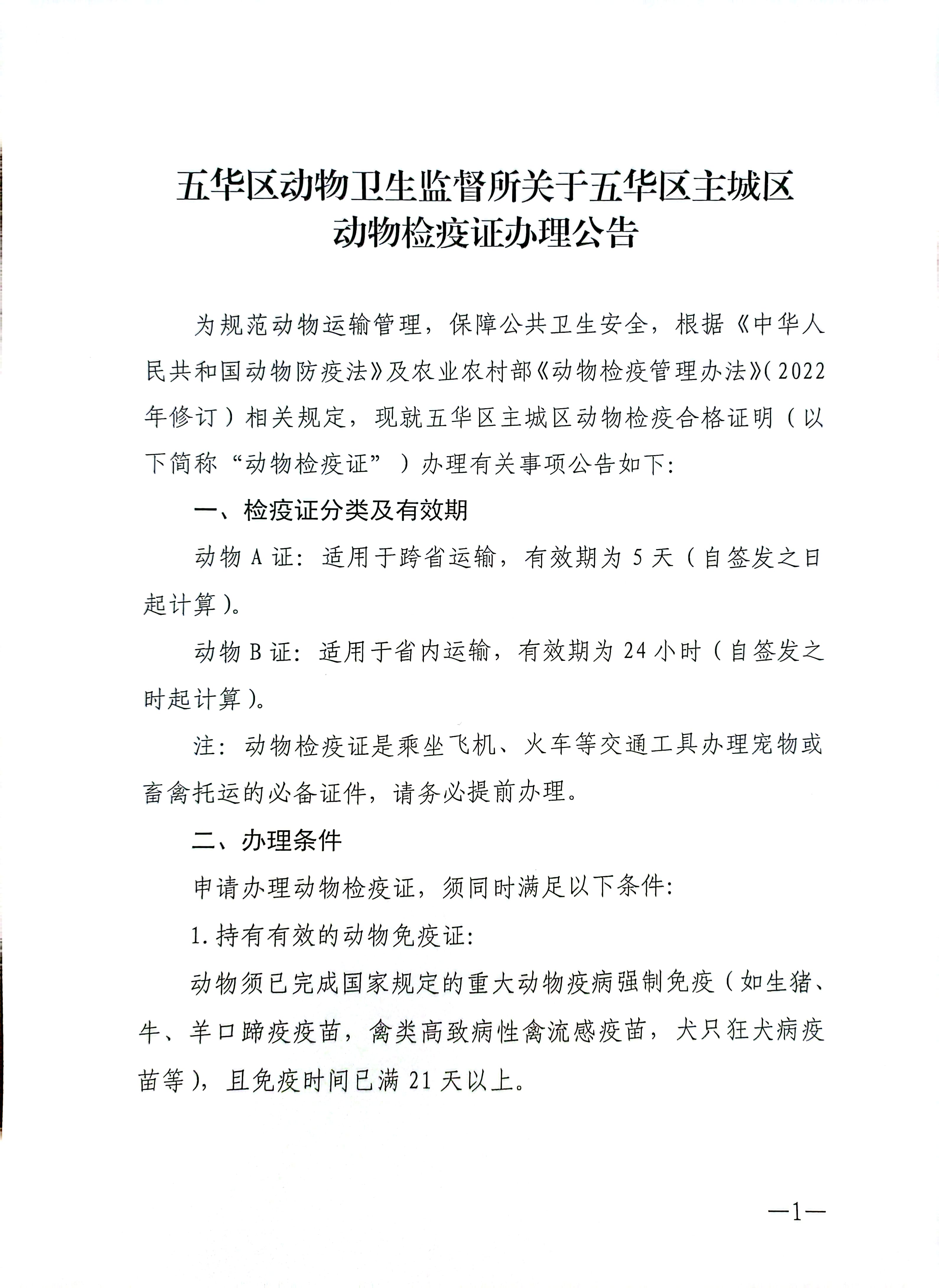 五华区动物卫生监督所关于五华区主城区动物检疫证办理公告
