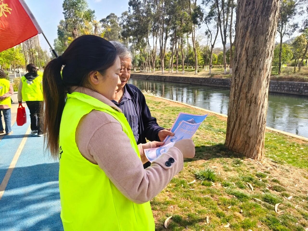 在世界水日及中国水周期间,霖雨社区于盘龙江沿岸开展“法治护河润民心 普法强基促水清”主题普法宣传活动。社区工作人员与党员志愿者通过发放宣传资料、现场讲解的方式,向过往居民重点普及《中华人民共和国水法》《中华人民共和国水污染防治法》等水资源保护相关法律法规,结合盘龙江保护治理实际,用通俗语言解读河道管护、污水排放、节约用水等知识。
