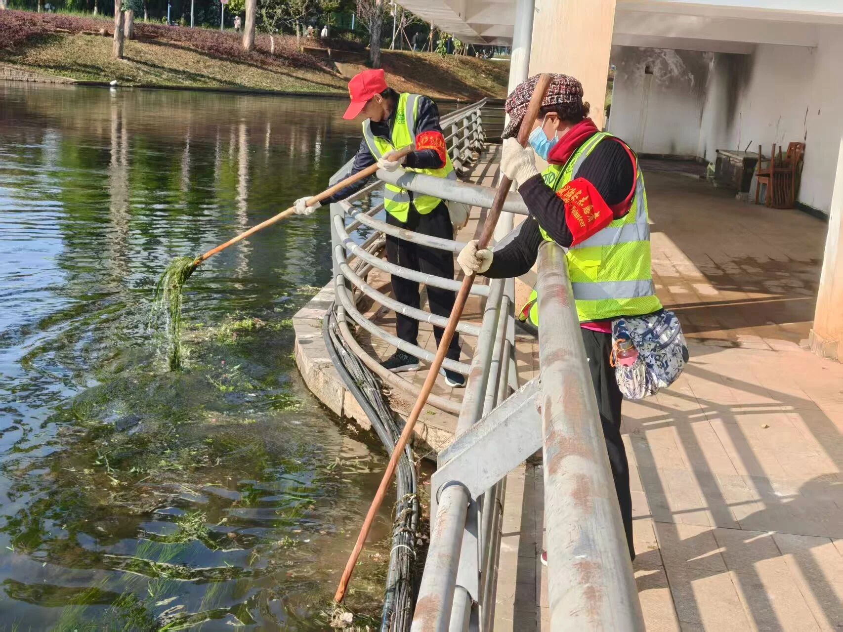 月牙塘社区则依托盘龙江市民巡河志愿队,开展常态化清杂巡查行动,志愿者们打捞水面漂浮物、清理沿岸杂草垃圾,凝聚“人人参与、共建共享”的护河共识。