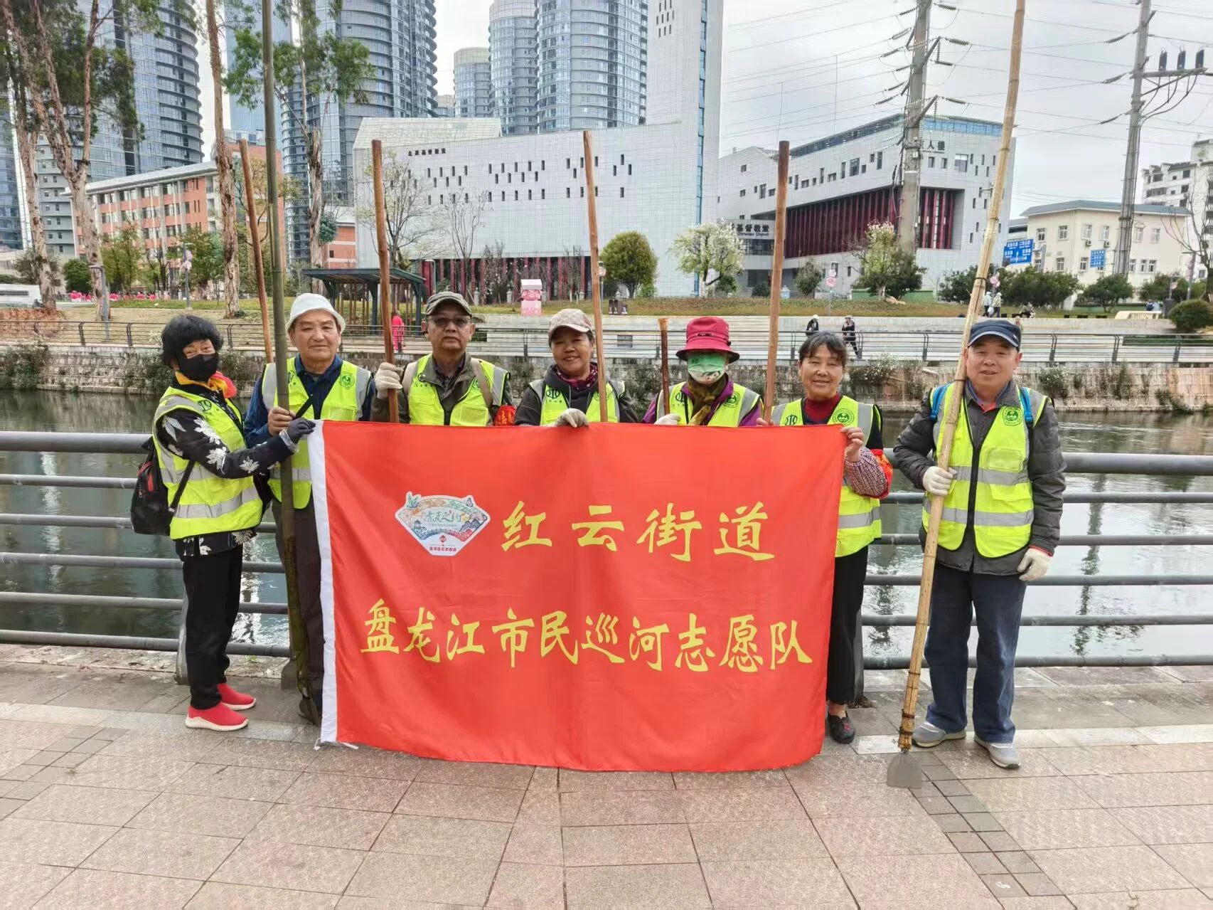 幸福家园社区党员志愿者手持清洁工具沿盘龙江步道巡查,铲除乱贴小广告、清扫休息区及绿化带死角垃圾,耐心劝导违规垂钓市民。专业巡河队伍对排污口、河道岸线违建、违规占用河道等情况进行细致排查登记,同时向周边市民传递护河理念。