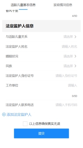(4)若需要添加法定监护人信息,点击【添加监护人】即可新增一条监护人信息,一个适龄儿童最多可填写两位法定监护人信息,法定监护人信息完善方可提交。