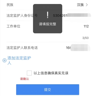 (3)填写法定监护人的联系电话:该号码会作为联系监护人的备用号码,请勿使用无关人员号码,务必真实有效,确保畅通;