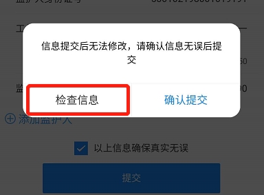 勾选“以上信息确保真实无误”后方可提交,点击【提交】系统会提示填写人核对信息,点击【检查信息】即可检查当前填报的信息,如下图所示: