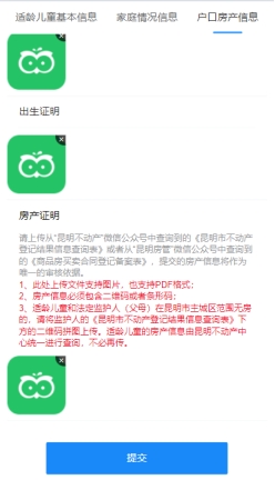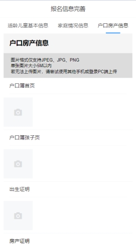 户口与房产信息一共需要上传四张照片,分别是适龄儿童所在户口簿首页照片,户口簿适龄儿童页照片,出生证明照片以及房产证明材料。