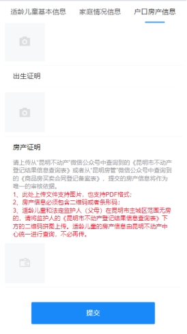 依次上传适龄儿童父亲、母亲、适龄儿童本人2026年3月20日以后开具的《昆明市不动产登记结果信息查询表》(单亲家庭可仅上传适龄儿童本人和取得抚养权一方监护人房产证明材料)。