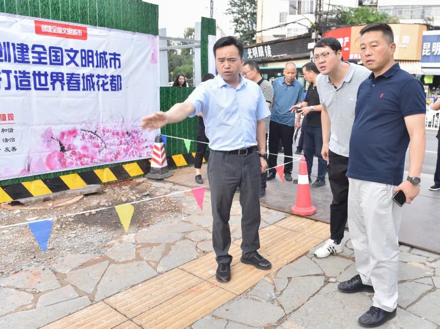 陈江一行先后来到铁局路与黄公东街雨污分流工程建设现场、昆师路雨污分流工程建设现场、人民西路潘家湾地铁站施工现场、南屏街、三市街与金碧路施工现场等地,对施工围挡情况进行实地察看,详细了解工程建设进度,听取相关负责人的工作汇报,对进一步加强围挡管理、提升市容环境质量和市容市貌相关工作提出指导意见。