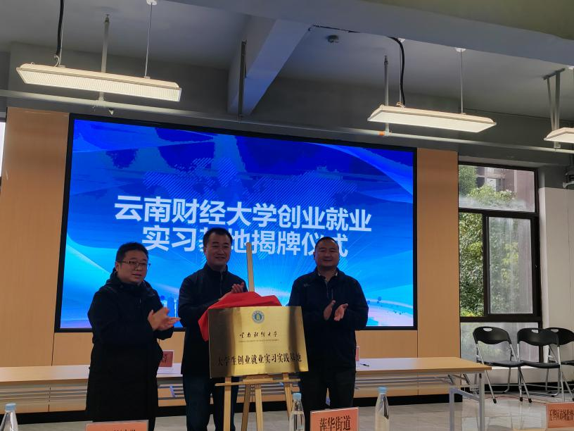 首先,云南财经大学招生职业发展中心主任霍嘉军、青创实业集团常务副总裁、五华区莲华街道办事处主任徐加共同为政校企合作合建进行了签约;云南财经大学副校长余怒涛、云南省青年创业协会会长贺靖、五华区政府莲华街道党工委书记张兴爻共同为云南财经大学青年创业就业实习基地进行揭牌。希望通过三方努力达到“优势互补、资源共享、相互联动、共同发展”的目的,实现政校企资源互补、高效推进、合作共赢!