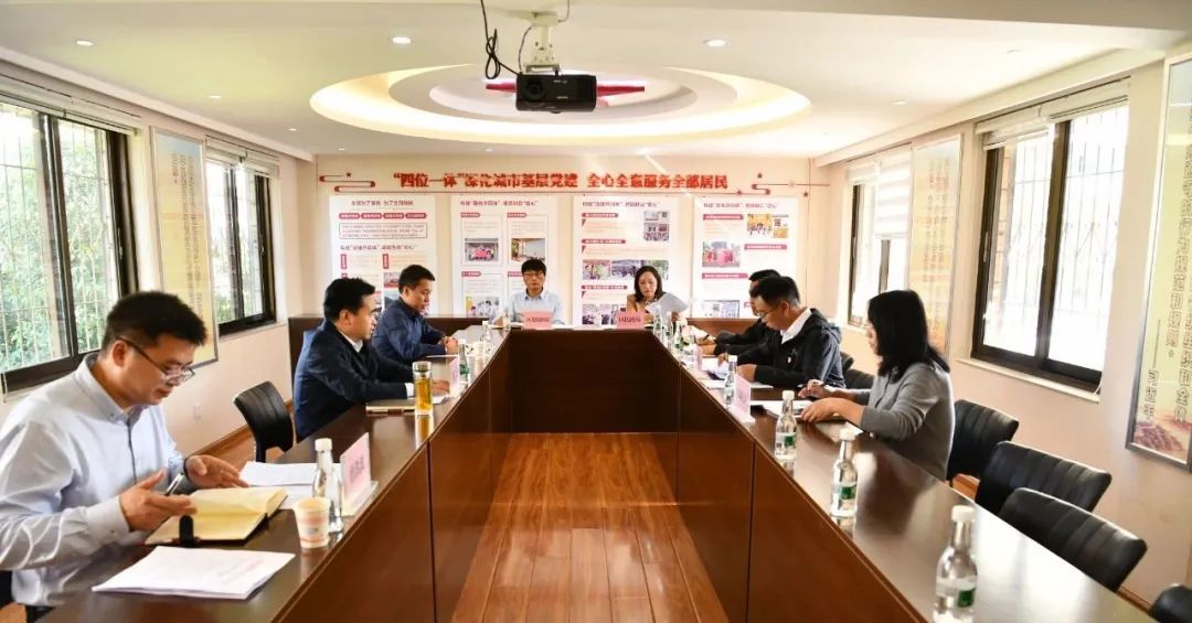陈江一行在实地调研翠湖社区挂牌规范化建设试点工作情况后,与参加调研的相关单位负责人进行座谈。区委组织部、区民政局、华山街道、翠湖社区相关负责人在座谈时汇报了学习推广虹山中路社区党建引领基层治理工作的经验做法、社区挂牌规范化建设试点工作的情况。