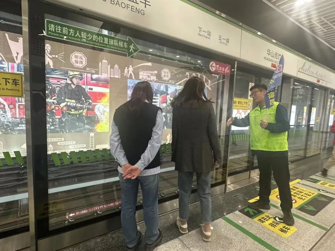 走进地铁5号线华山西路站,在地铁工作人员带领下,社区党员参观了地铁站厅、站台和车控室并通过工作人员现场讲堂、有奖竞答的形式向党员们讲解了地铁安保安检、票务政策、文明出行以及乘客换乘和进出站指南等内容让“我们”与5号列车来了一次亲密的接触。随后社区党员手握“文明出行”、“有序排队”的小旗在列车门前引导乘客文明乘车,对不排队候车、乱扔垃圾等不良行为加以制止。