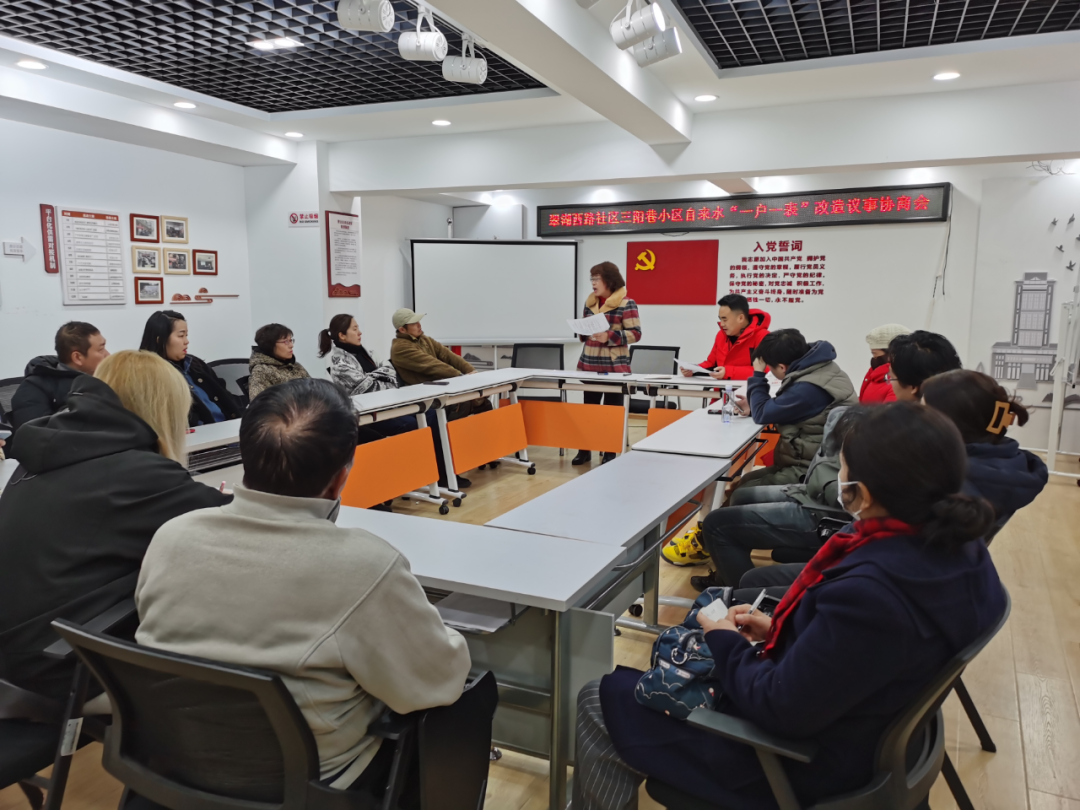 12月22日居民们陆续来到翠湖西路社区会议室,大家你一言我一语,讨论着多年来悬而未决的自来水一户一表改造问题。在社区党委的牵头下,居民代表协商后一致同意进行改造,后续改造工作正式提上日程,困扰大家多年的“烦心事”有望得到彻底化解。