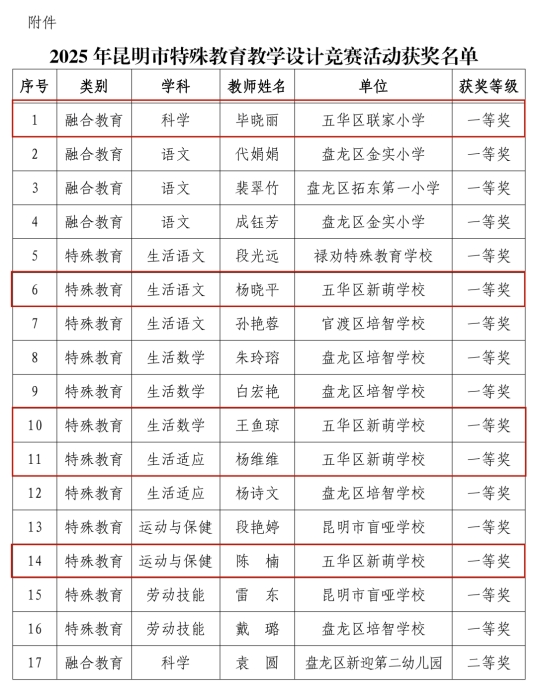 由市教育体育局主办的2025年昆明市特殊教育教学设计竞赛活动圆满结束。本次教学竞赛五华区共报送作品44件,占全市报送作品数的26.5%,其中特殊教育学校(新萌学校)27件,普校17件。经专家遴选、集中复审,五华区共计荣获一等奖5件,二等奖8件,三等奖12件,获奖作品数占全市获奖作品数25%,特殊教育学校(新萌学校)获奖数居全市首位。