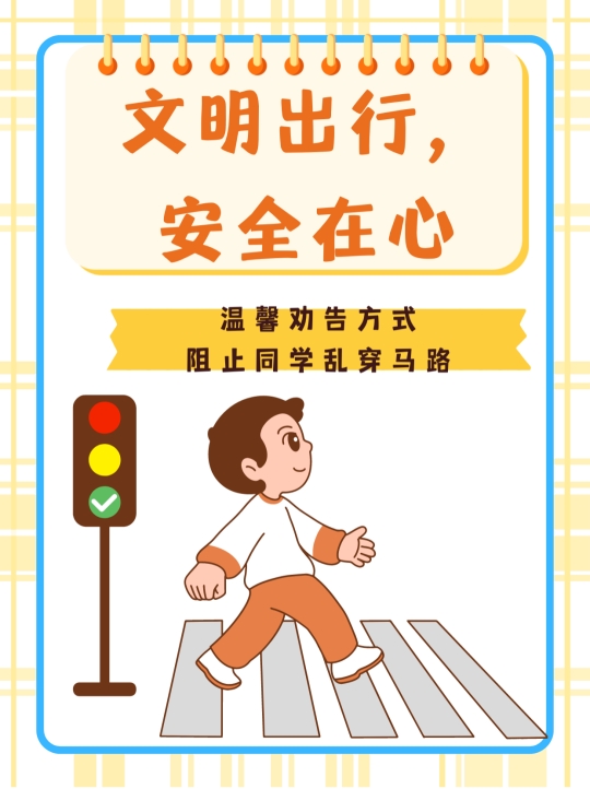 1. 遵守交规:外出时,严格遵守交通规则。步行时走人行道,过马路走斑马线,不闯红灯,不翻越隔离栏。未满12周岁不骑行自行车上路,未满16周岁不骑行电动自行车。乘坐电动车、摩托车请正确佩戴头盔。