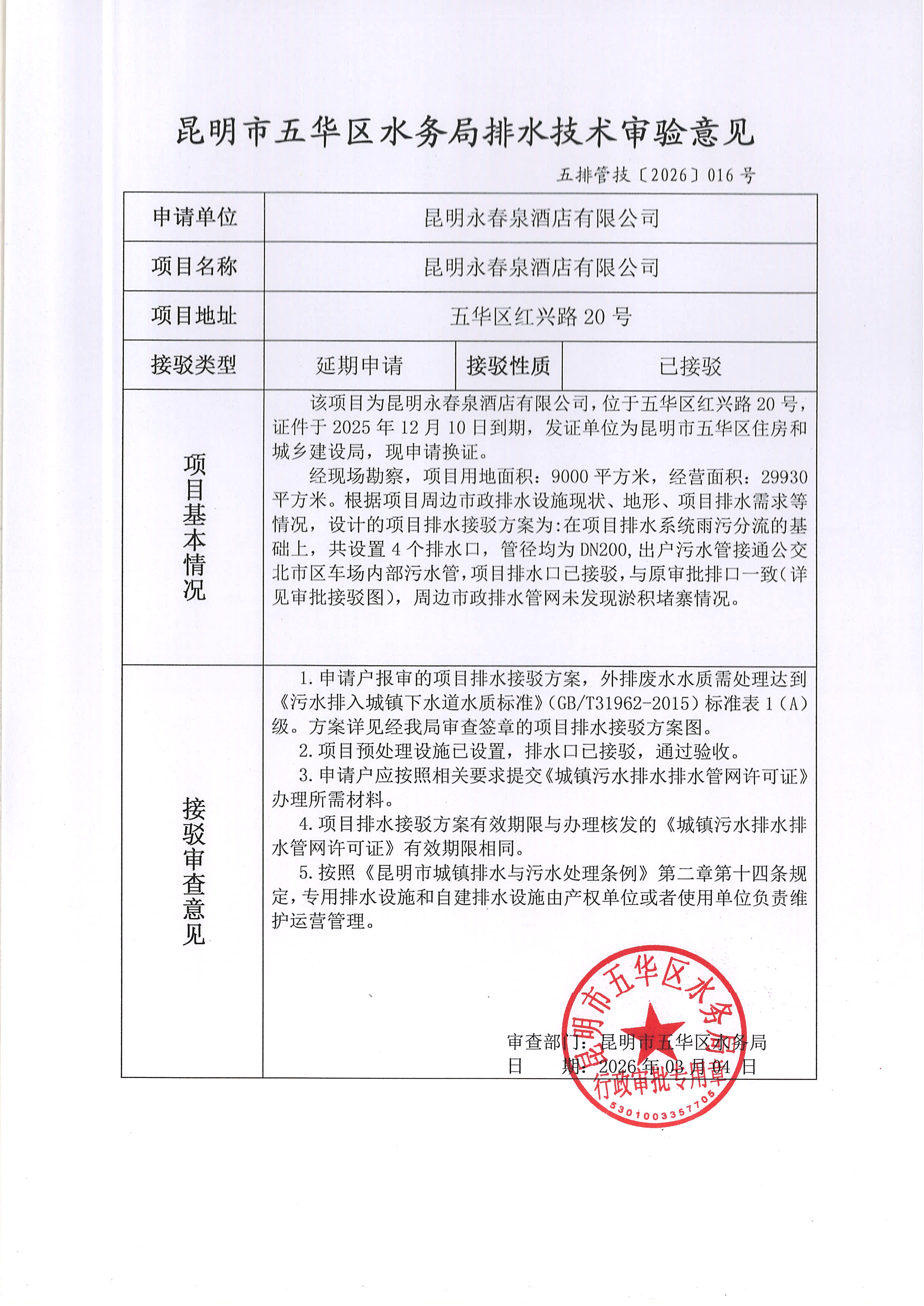 昆明市五华区水务局排水技术审验意见五排管技【2026】016号
