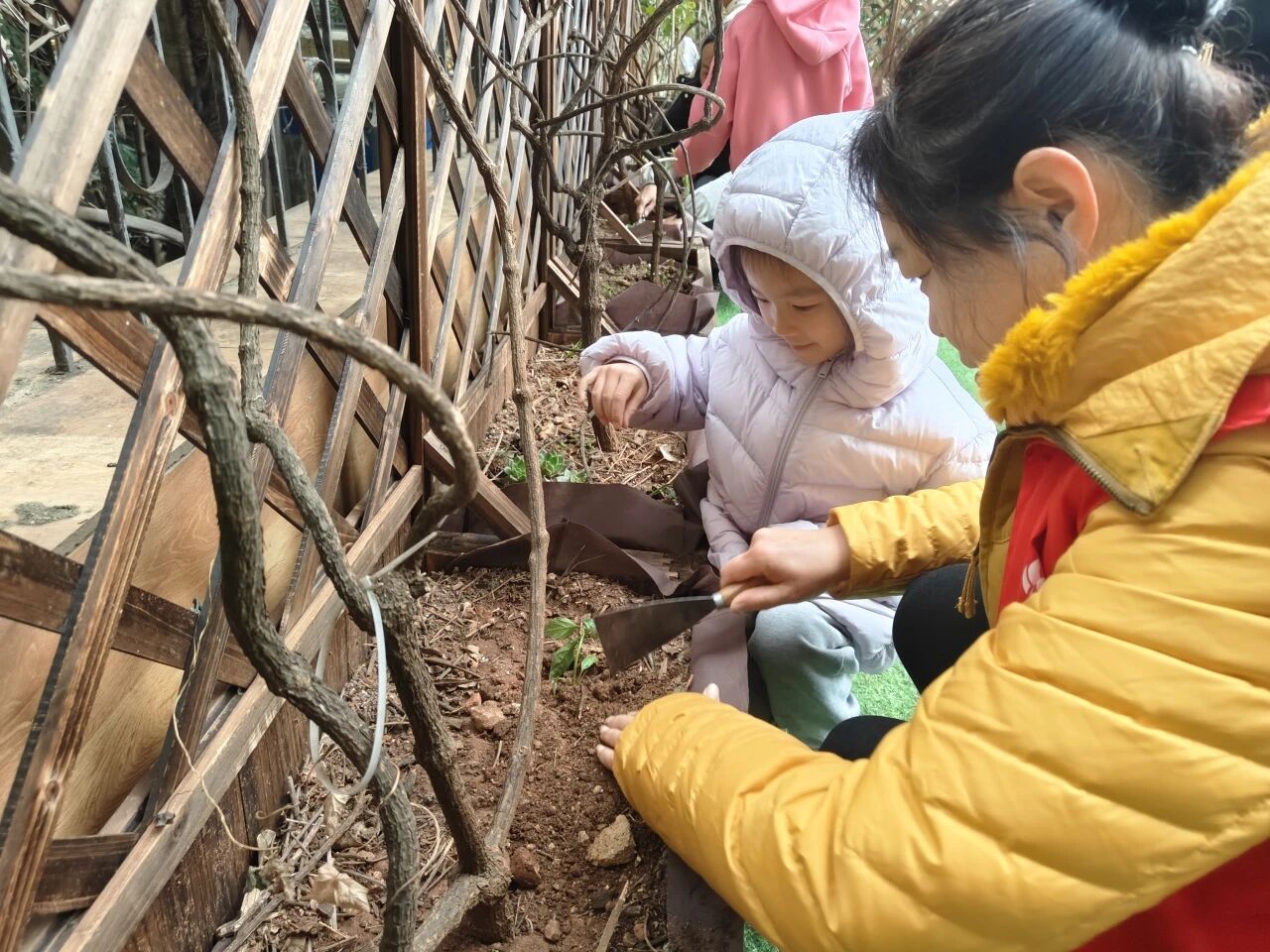 小铲挖土时的认真模样、扶苗培土时的小心翼翼、浇水时的满满爱意,每个环节都充满童趣与热情。大家分工配合、默契协作,不一会儿,一株株嫩绿的新苗整齐挺立在露台,成为春日里最动人的风景。